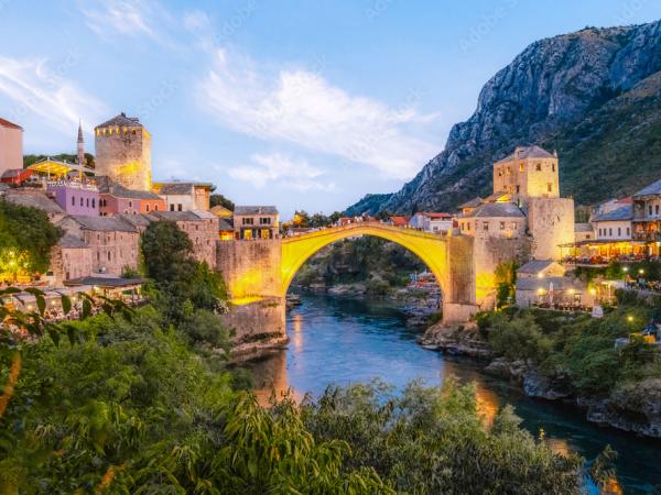 Συνεχίζουμε για το Μόσταρ. Το Μόσταρ είναι μία γοητευτική Πόλη, κάτω από το καταπράσινο βουνό Velez, ;εχει την γνωστή εμβληματική Παλιά Γέφυρα, (Οθωμανικού τύπου, χτίστηκε μεταξύ 1557 -1566), που διασχίζει τον ποταμό Νερέτβα. Αυτή η Γέφυρα του 16ου Αιώνα έχει ύψος 27 μέτρα. Αποτελεί Σύμβολο της πλούσιας Ιστορίας και της Πολιτιστικής κληρονομιάς της Πόλεως. (Παγκόσμιο Πολιτιστικό Μνημείο της Unesco) Στο Μόσταρ θα έχουμε την ευκαιρία να περπατήσουμε στα πλακόστρωτα δρομάκια και στις δύο πλευρές τών όχθεων του ποταμού Νερέτβα, βλέποντας παραδοσιακά κτίρια, μαγαζάκια κάθε λογής, κήπους και καφενέδες.Επίσης θα εξερευνήσουμε την πλούσια Αγορά αλλά και θα απολαύσουμε την παραδοσιακή κουζίνα.(κεμπάπ στα κάρβουνα – cevapi και άλλα κρεατικά) που σου σπάει την μύτη.Αναχωρούμε για το ΤΡΕΜΠΙΝΙΕ, την ωραιότερη πόλη των Σέρβων της Βοσνίας – Ερζεγοβίνης. Προτού φθάσουμε στο Trebinje, θα επισκεφθουμε για να προσκυνήσουμε στο Μεσαιωνικό Ορθόδοξο Μοναστήρι του Tvrdos, το οποίο είναι αφιερομένο στην Κοίμηση της Υπεραγίας Θεοτόκου. Κατασκευάστηκε τον 15ο Αιώνα. Αξιοθέατο με ιδιαίτερο ενδιαφέρον, αποτελούν τα Κελάρια του φημισμένου Κρασιού της Μονής. Χρονολογούνται από τον 15ο Αι., ενώ είναι σε χρήση μέχρι σήμερα για την παρασκευή των πολύ γνωστών Κρασιών του Μοναστηριού. Οι Καλογέροι με χαρά θα μας προσφέρουν να δοκιμάσουμε από το καταπλκκτικό Κρασί.Φτάνουμε στην πόλη. Η Πόλη είναι ευλογημένη από την φύση και βρίσκεται στις όχθες του ποταμού Trebisnjica. Οι Ορθόδοξες Εκκλησίες (ιδιαίτερα της Αγίας Μεταμόρφωσης) και τα παραδοσιακά Αρχοντικά σπίτια, δημιουργούν μία εικόνα πλούσιου πολιτισμού. Όλα αυτά εκτίθενται στα Μουσεία αλλά και στο φωτεινό Μοναστήρι Hercegovacka Gracanica, στην κορυφή του λόφου. Ξεχωρίζει η παραδοσιακή και φωτισμένη Γέφυρα της Πόλεως, Αρσλαναγκιτς του 16ου Αιώνα από τον Μεχμέτ Πασά Σοκόλοβιτς. Θα αντικρίσουμε απεικονίσεις των σπουδαίων Νίκολα Τέσλα, Μιχαϊλο Πούπιν αλλά και Στρατιωτικών και Πολιτικών Σέρβων Προσωπικοτήτων. Το Τρέμπινιε είναι πατρίδα του σπουδαίου Σέρβου Ποιητή και Διπλωμάτη Ivan Ducic.Τακτοποίηση στο ξενοδοχείο μας. Δείπνο. Ελεύθερος χρόνος για να γνωρίσουμε την νυχτερινή ζωή της Παλιάς Πόλης του Τρέμπινιε. Διανυκτέρευση.